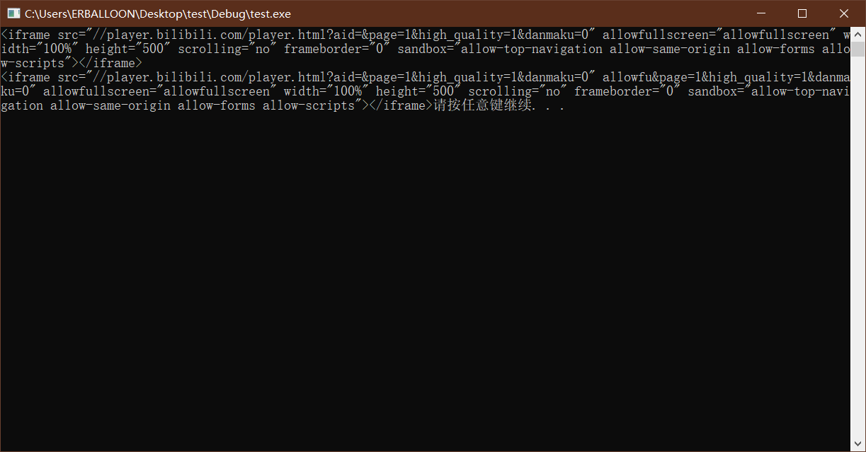char *end = (char *)"&page=1&high_quality=1&danmaku=0\" allowfullscreen=\"allowfullscreen\" width=\"100%\" height=\"500\" scrolling=\"no\" frameborder=\"0\" sandbox=\"allow-top-navigation allow-same-origin allow-forms allow-scripts\"></iframe>";