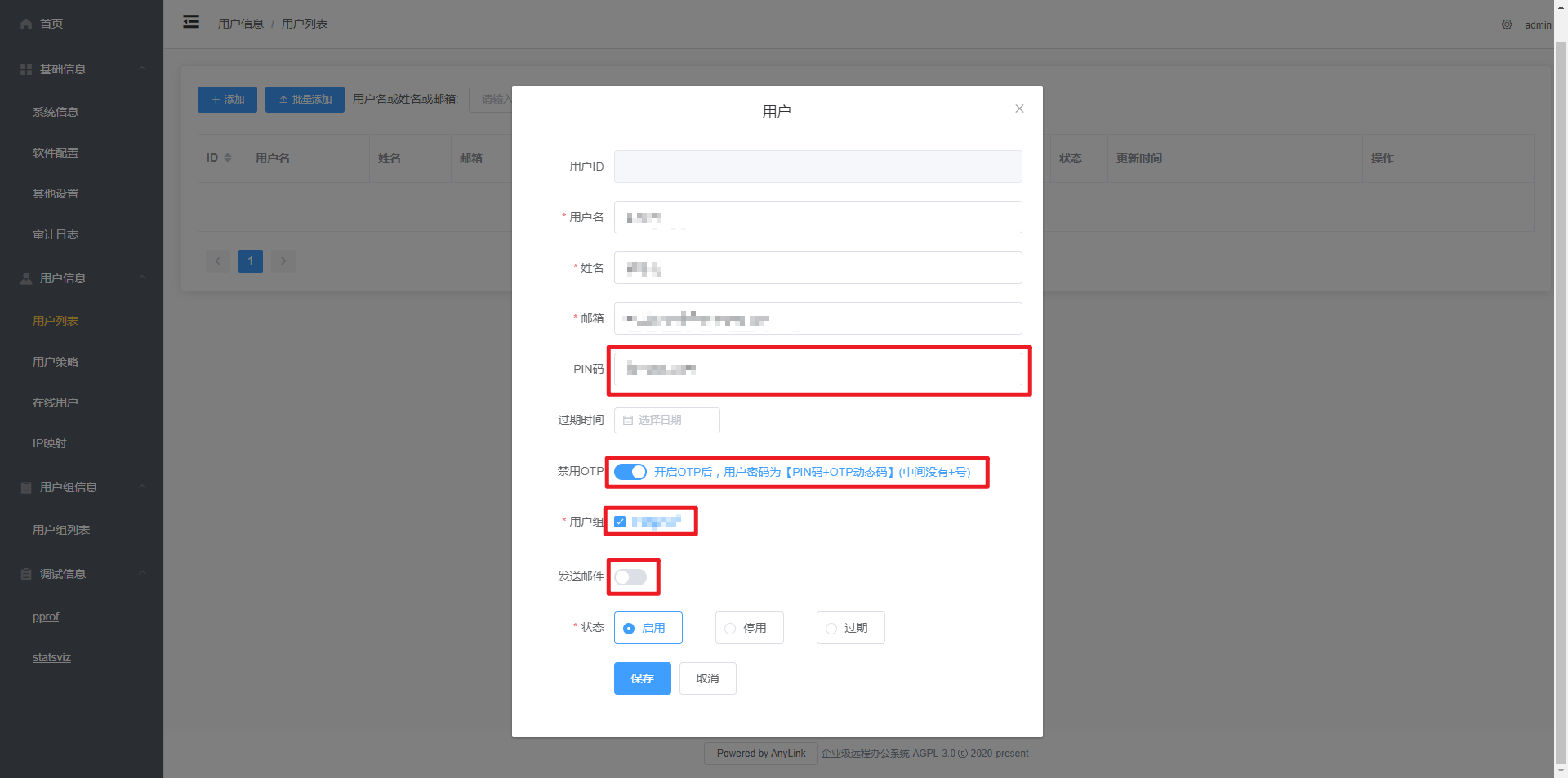 [2]创建用户的,PIN就是密码,需要禁用OTP,选择用户组,并且不发送邮件