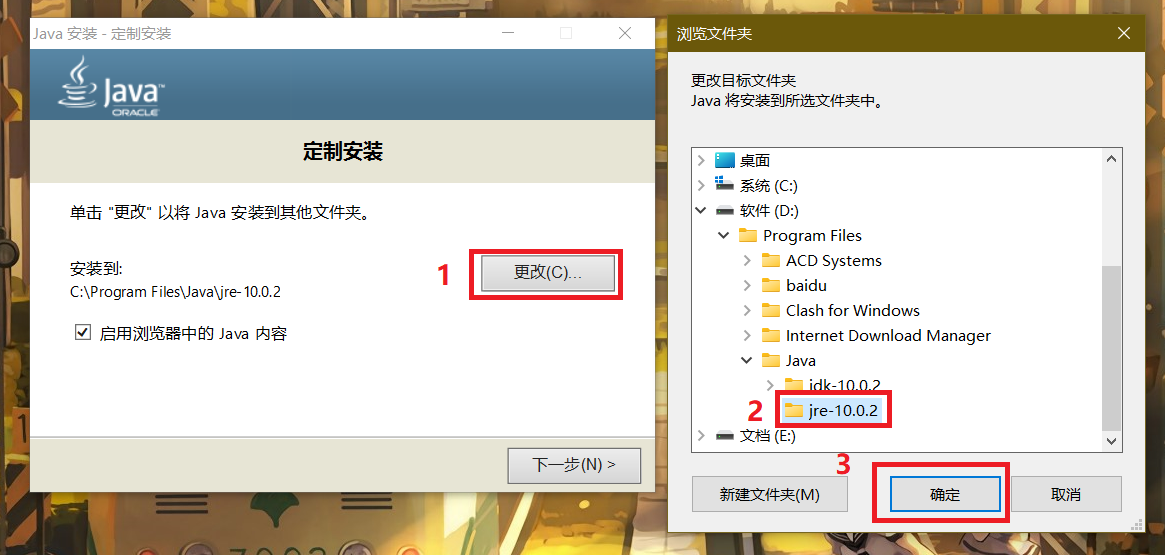 弹出JRE的安装界面时也需要修改,因为JRE默认安装到C盘