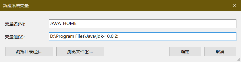 变量名:JAVA_HOME  变量值:D:\Program Files\Java\jdk-10.0.2;