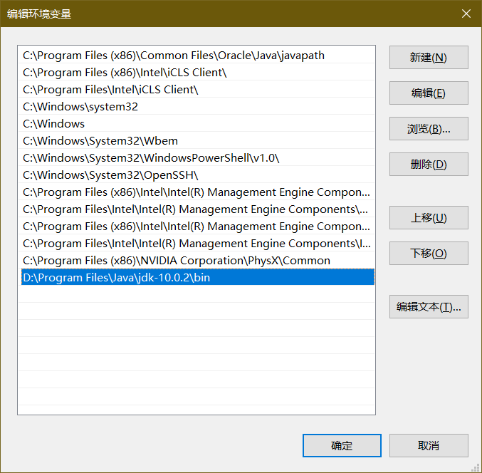 在Path变量中添加:D:\Program Files\Java\jdk-10.0.2\bin