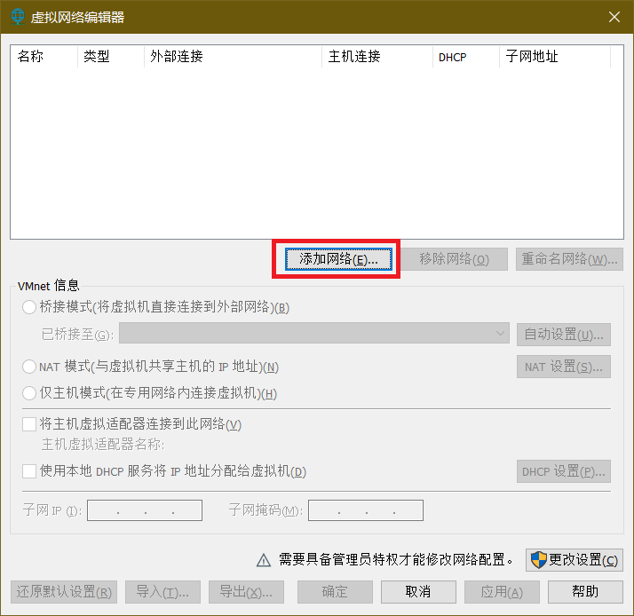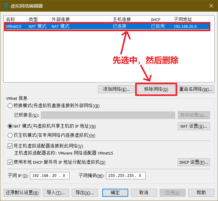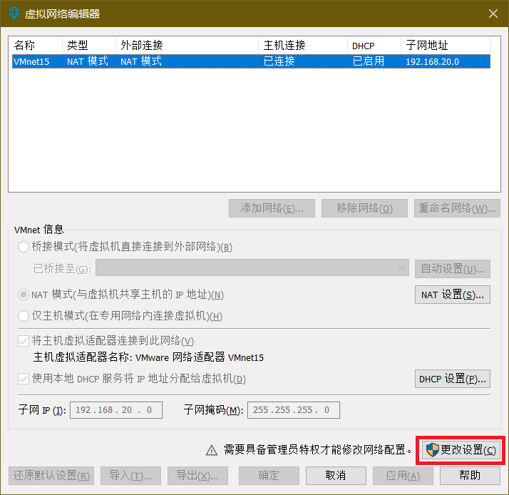打开虚拟网络编辑器 点击更改设置 为了演示,删除所有的网络配置 打开控制面板->网络和Internet 网络和共享中心 更改适配器选项 可以看到vmware的虚……