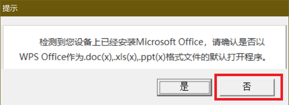 5.注意:凡是Office和WPS软件内询问是否设置为默认应用之类的一律选择“否”且不再显示对话框