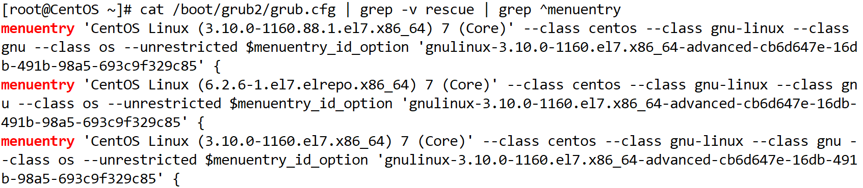 cat /boot/grub2/grub.cfg | grep -v rescue | grep ^menuentry
