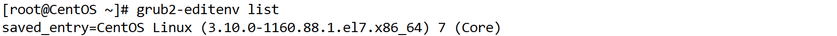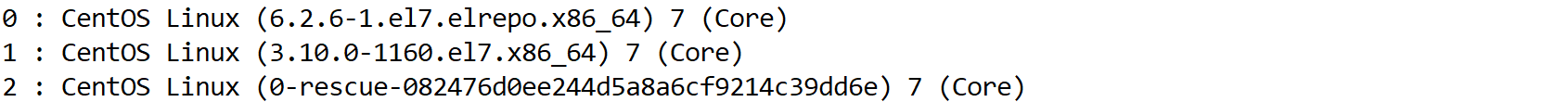 grub2-editenv list -> saved_entry=CentOS Linux (6.2.6-1.el7.elrepo.x86_64) 7 (Core)