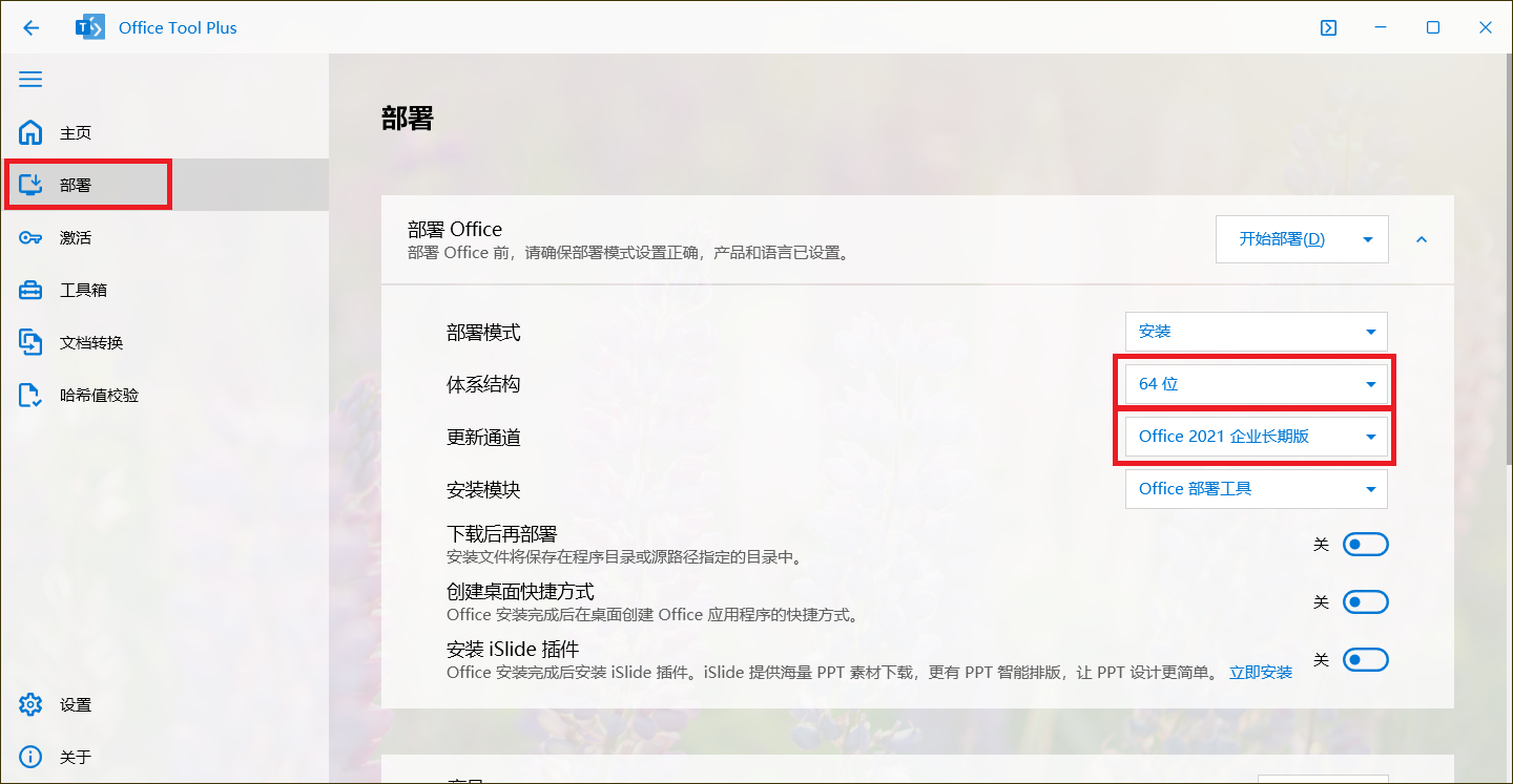 点击左侧的部署->体系结构选择64位->更新通道选择2021 LTSC