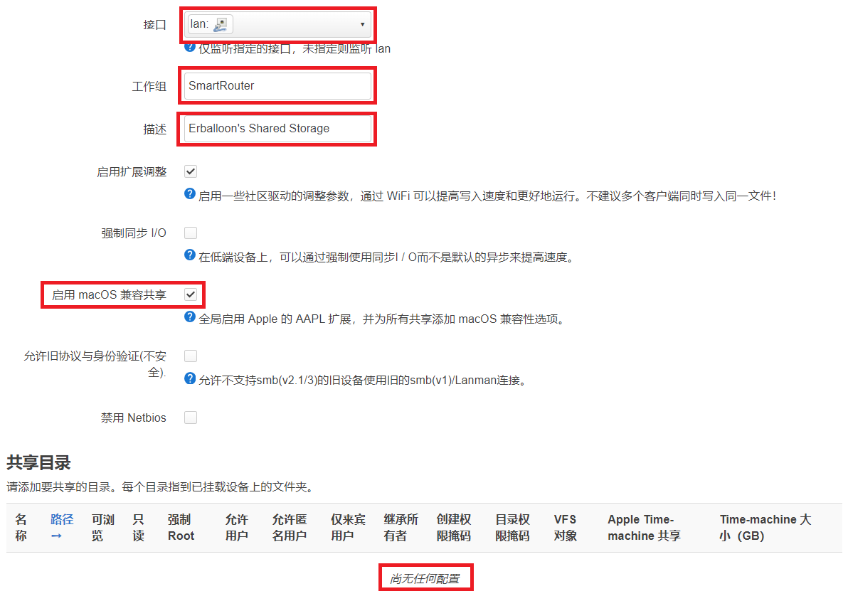 2、luci页面上不需要配置任何共享目录,如果有删去