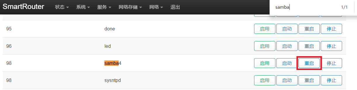 luci页面上依次点击系统->启动项,按 ctrl + f 搜索 samba 点击重启