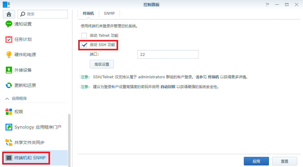 控制面板 -> 终端机和SNMP -> 使能SSH功能