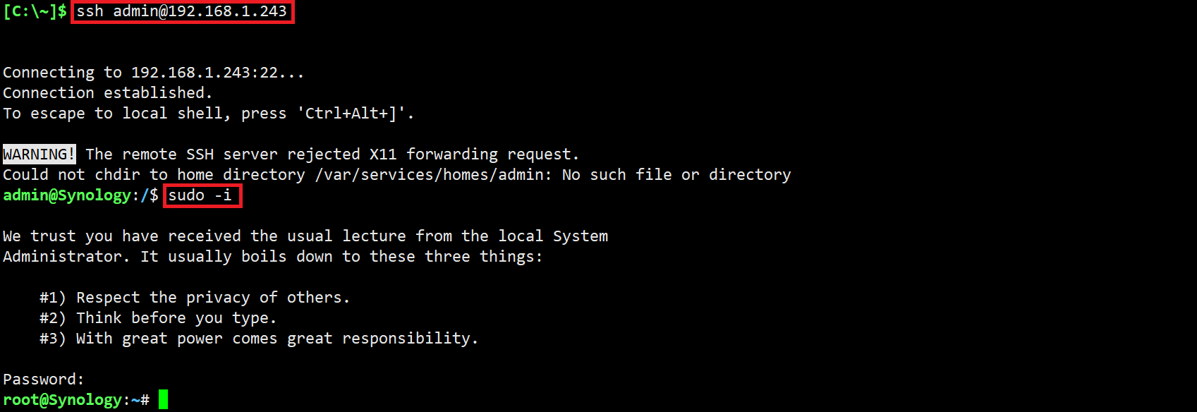 输入ssh admin@群辉的IP地址 ,再根据提示输入admin用户密码进入群辉后台
