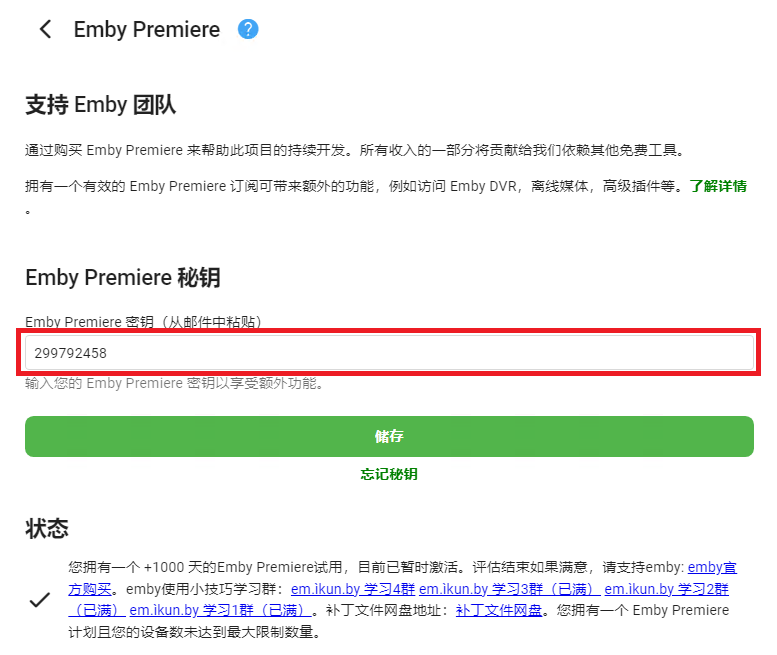 最后在设置中找到Emby Premiere,随便输入一串数字即可激活