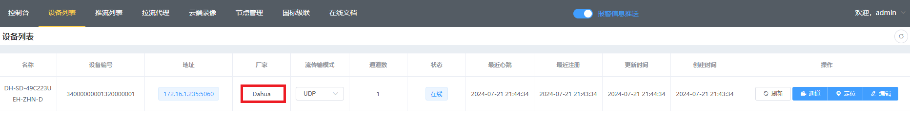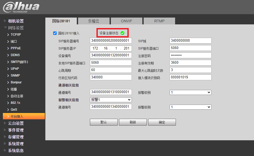 这里以大华摄像头(推荐)为例,进入网络设置,平台接入,完成信息填写后打开GB28181功能,则可以看到已成功注册