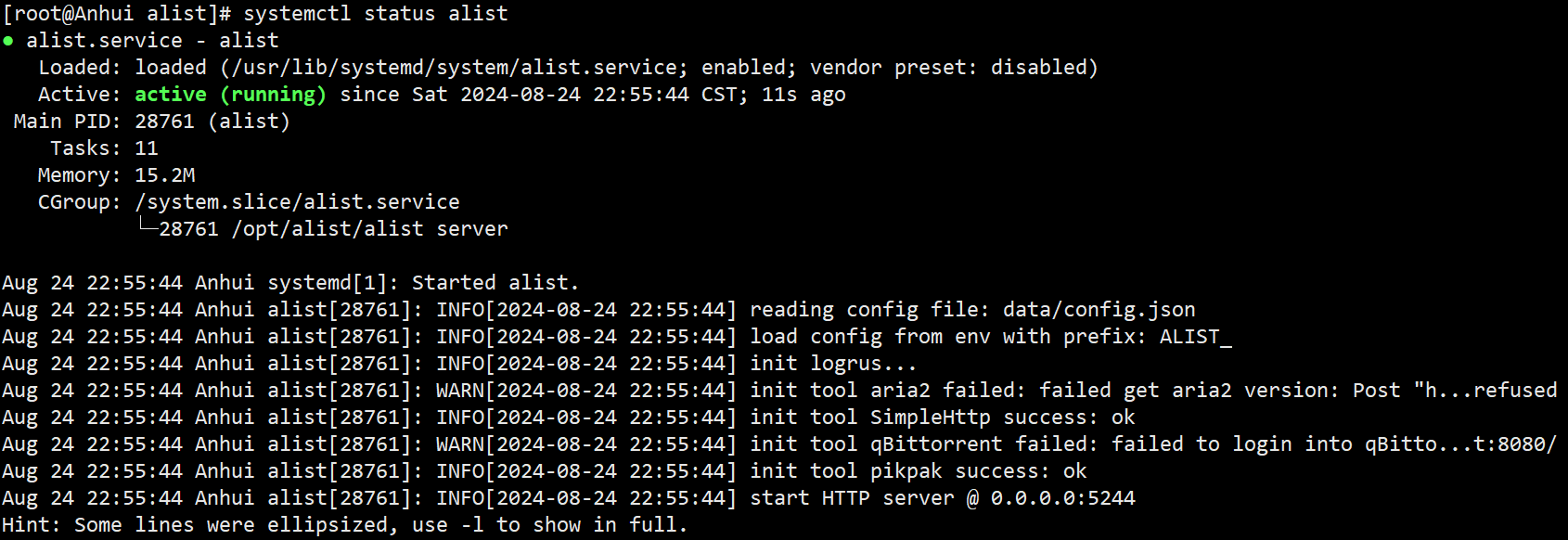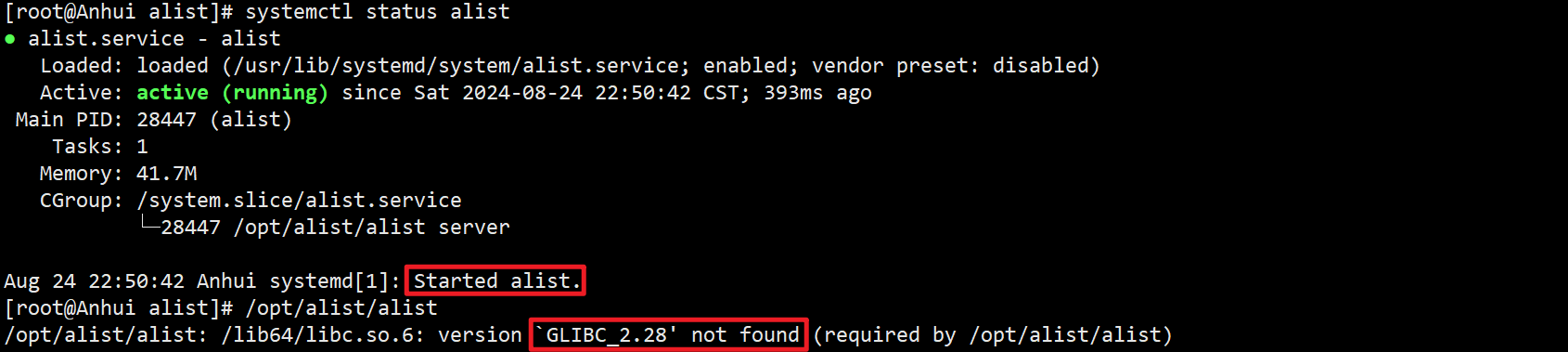 启动alist并观察状态,如果启动以后没有任何输出且提示下面的报错