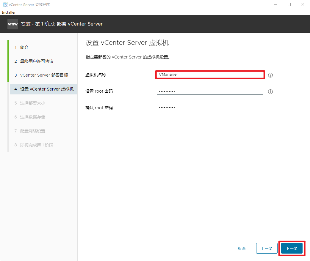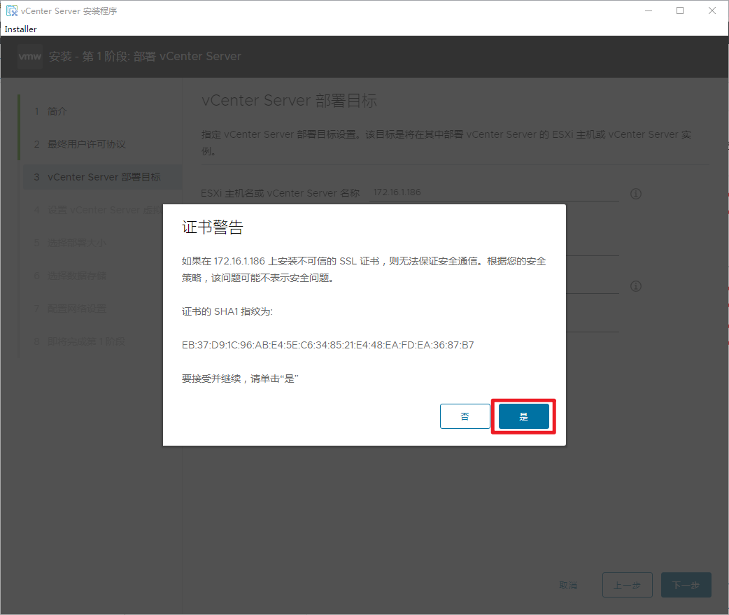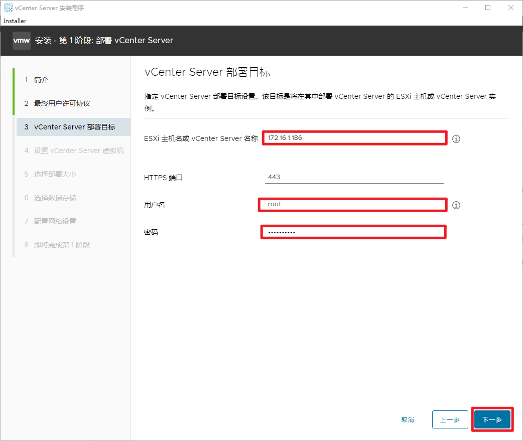 ESXi主机名输入想要安装VCSA的ESXi的IP地址,用户名输入root,密码输入ESXi的密码,完成后下一步