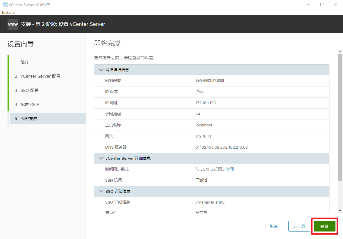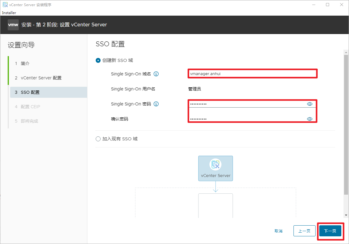 SSO域名可以自定义,在登录的时候用户名就是administrator@域名,例如本例就是administrator@vmanager.anhui,密码自定义,点击下一步