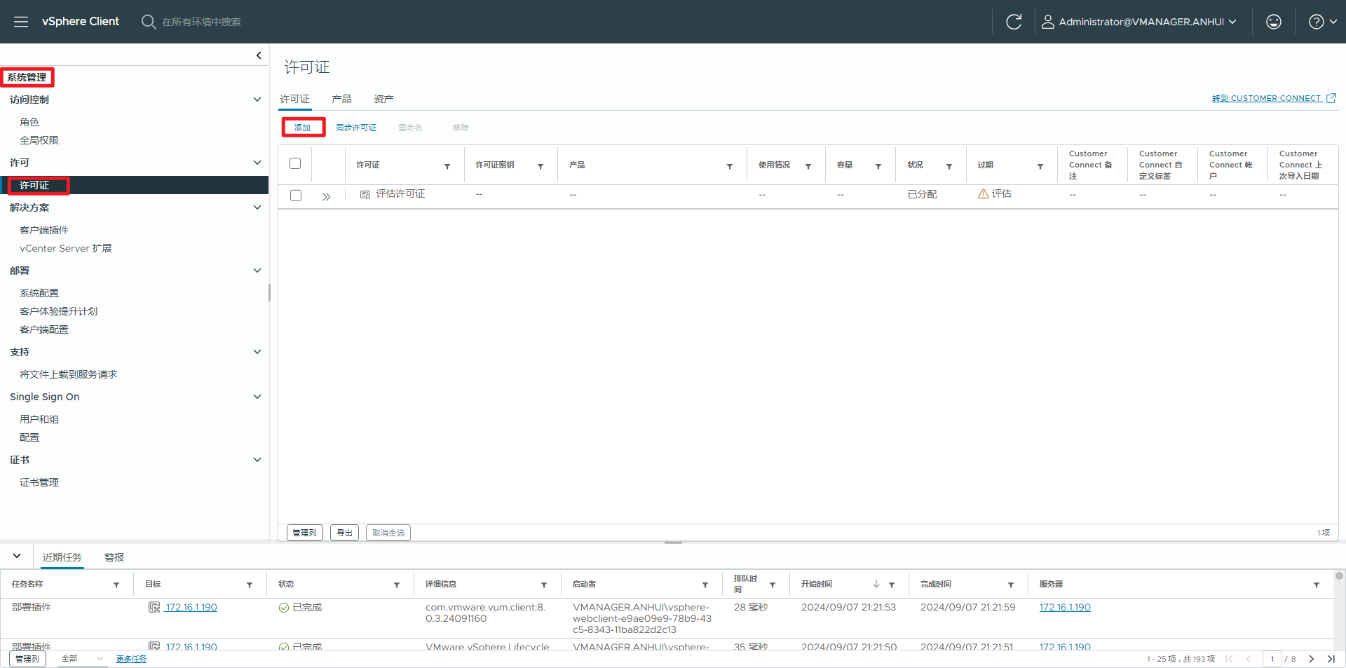 第二阶段安装完成之后,输入VCSA的IP地址,进入网页,依次点击系统管理->许可证->添加