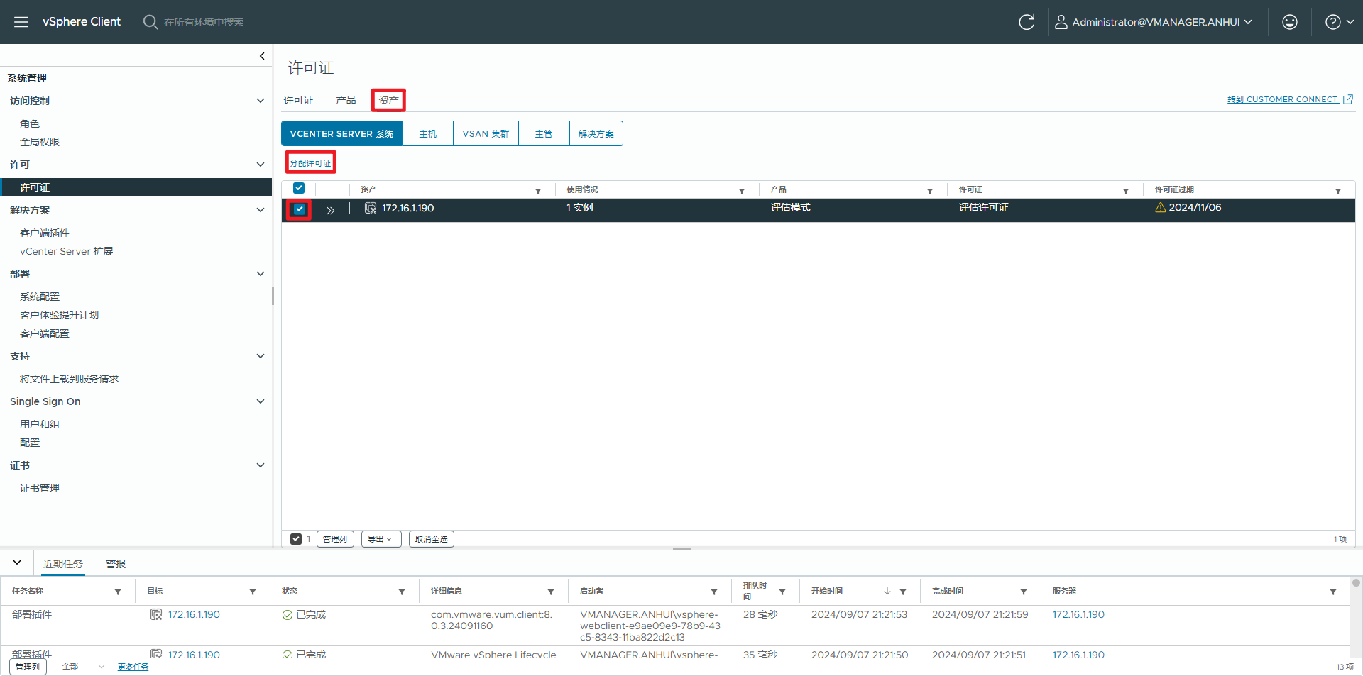 按照提示导入许可证,点击资产,选择VCSA,点击分配许可证