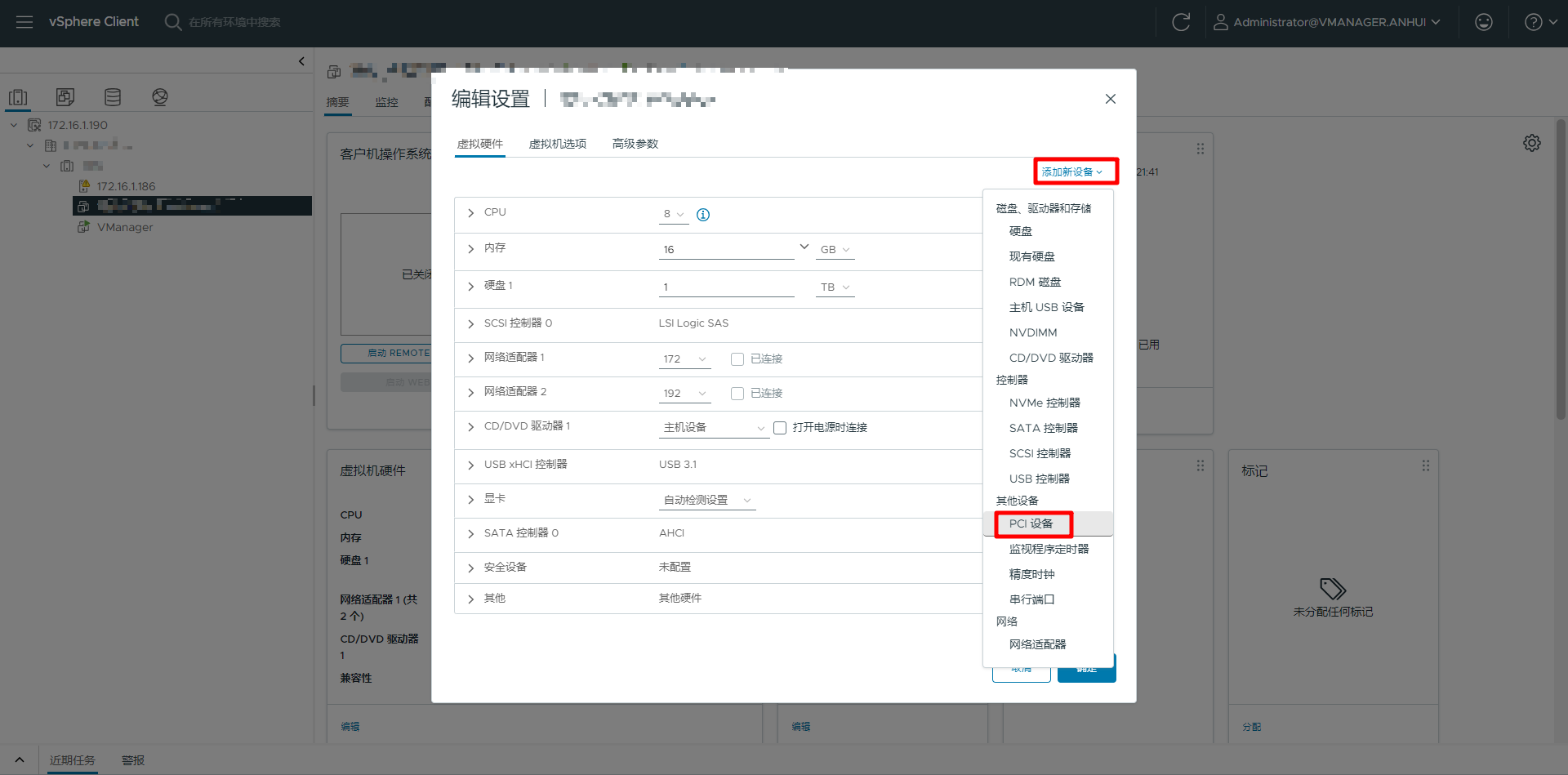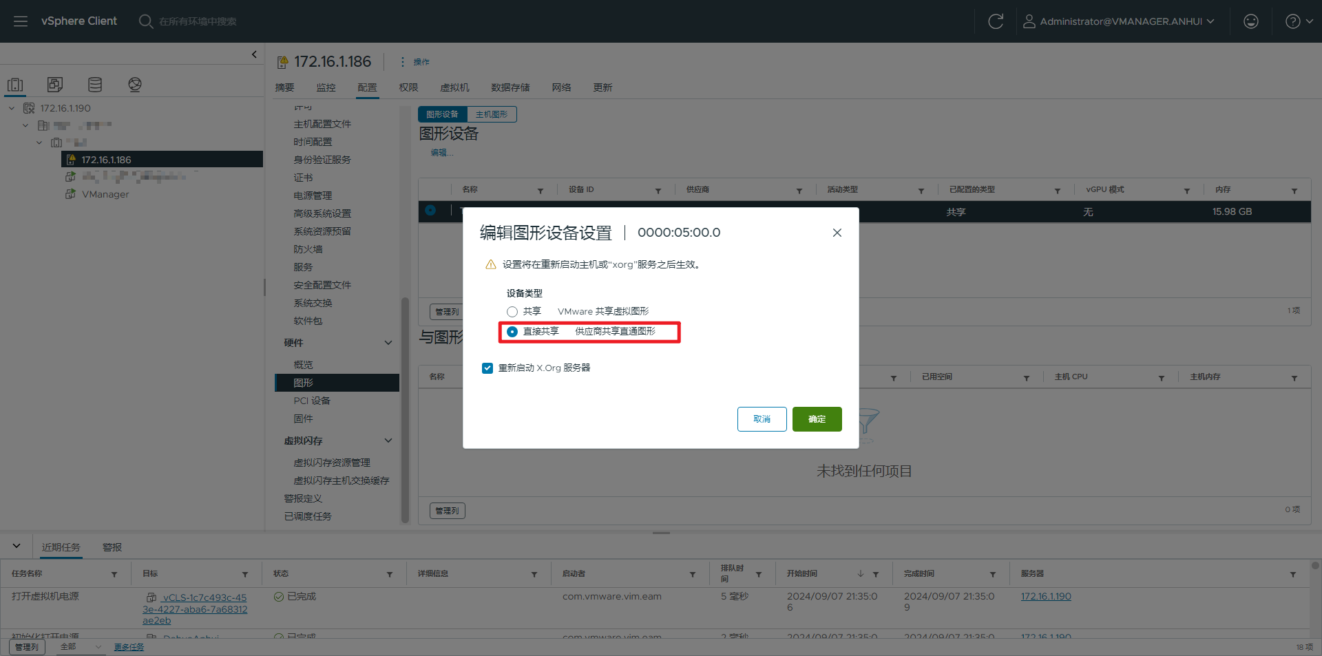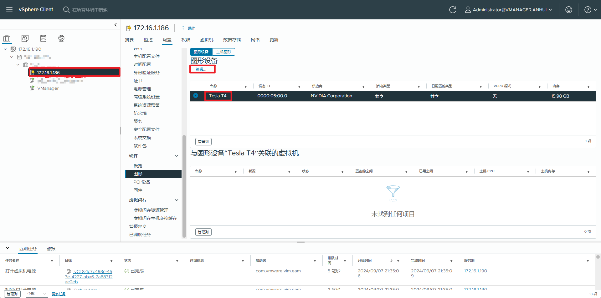 按照提示将ESXi主机添加进VCSA集群,找到对应的ESXi主机,点击配置,图形,选择图形卡,点击编辑