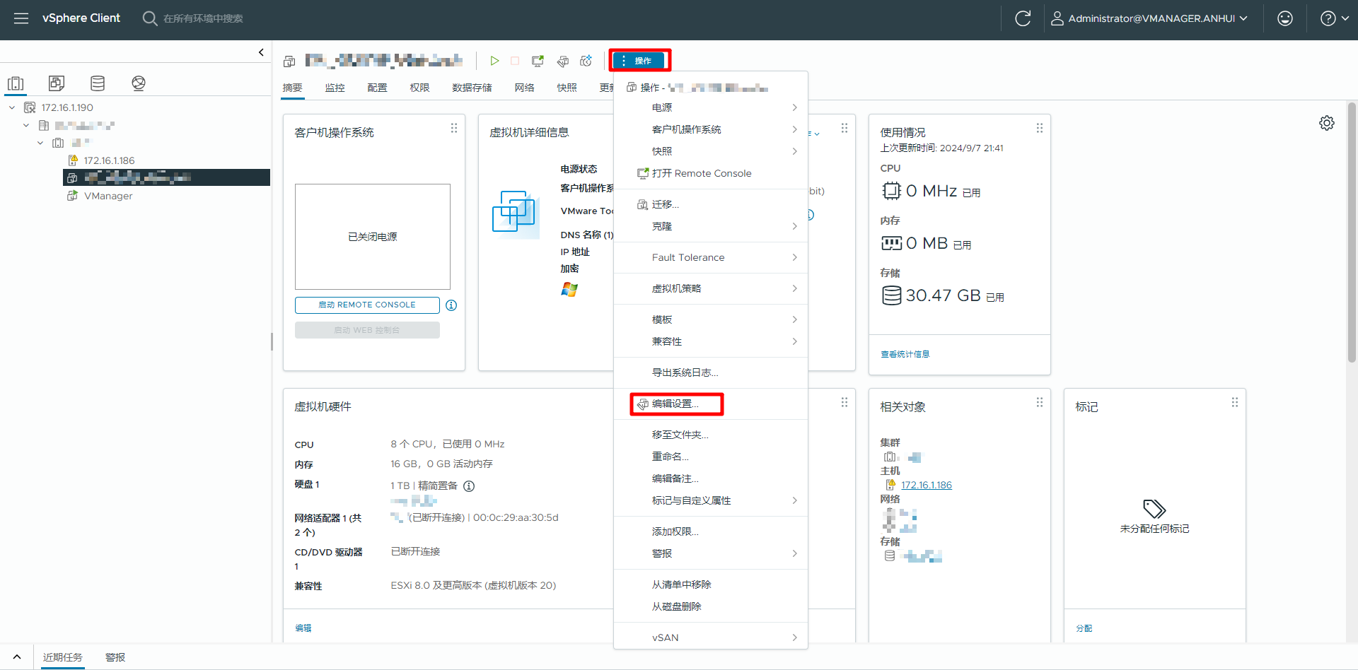 关闭Windows虚拟机电源,点击操作,点击编辑设置