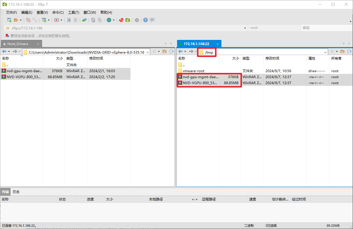用SSH连接工具进入ESXi后台,并用SFTP工具将以上两个文件拷贝到ESXi的/tmp 路径下