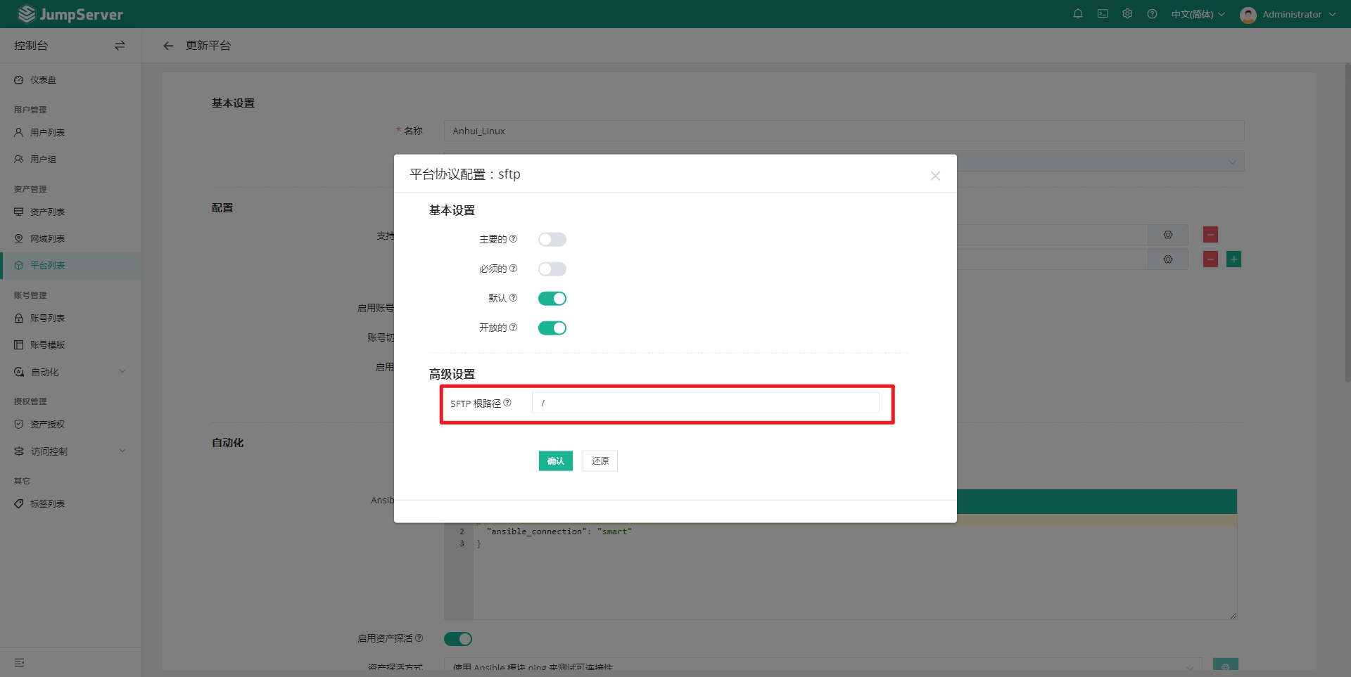 找到支持的协议 -> sftp后面的设置 -> 将SFTP根路径改成其他