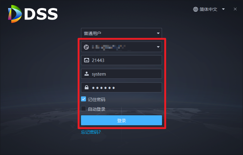 安装客户端并打开,填写公网地址,21443端口,用户名是system,密码默认是123456