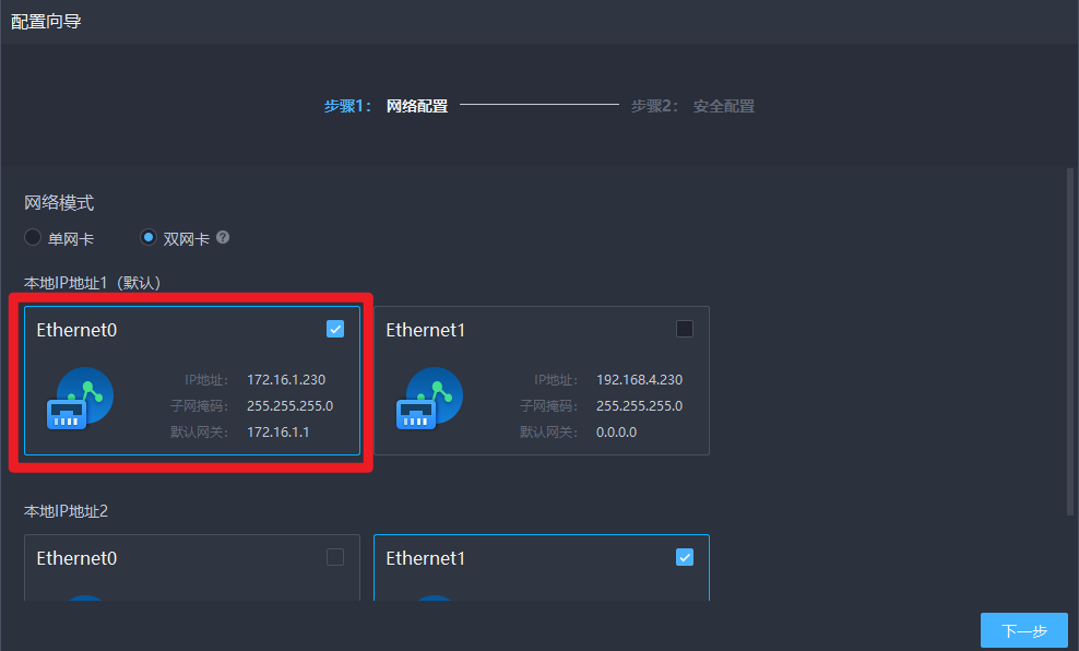 根据实际情况选择单网卡还是双网卡,我这里选择双网卡(如果是多张网卡,可以同时添加多个网段的设备,看现场网络规划)
