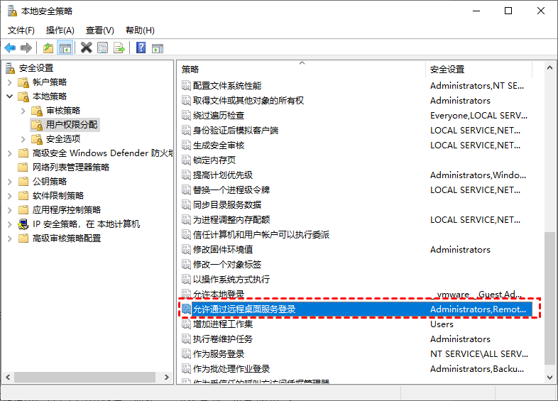 步骤2. 导航至此处:本地策略 >用户权限分配,再双击打开“允许通过远程桌面服务登录”。