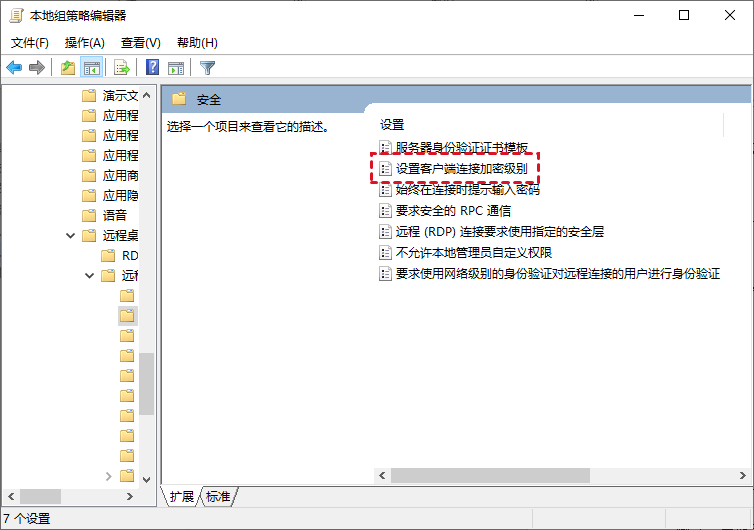 步骤2. 导航至此处:计算机配置 > 管理模板 > Windows 组件 > 远程桌面服务 > 远程桌面会话主机 > 安全,在右窗格中双击打开“设置客户端连接加密级别”。