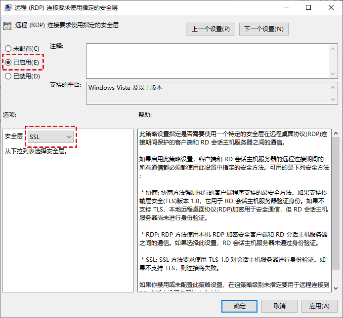 步骤5. 再双击打开“远程(RDP)连接要求使用指定的安全层”,将其状态更改为“已启用”并设置安全层为“SSL”。