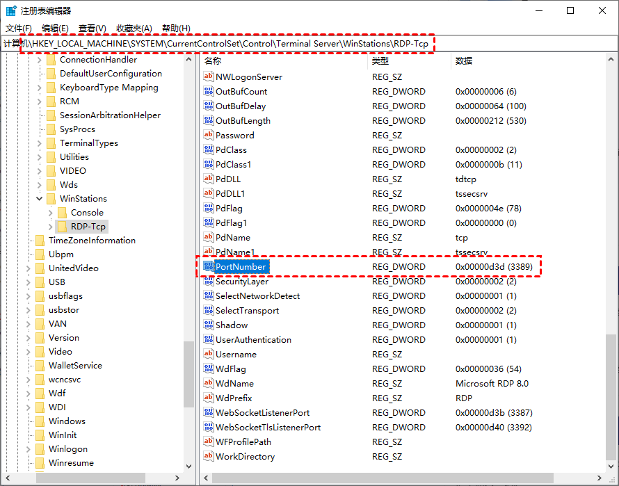 步骤2. 导航至此处:HKEY_LOCAL_MACHINE > System > CurrentControlSet > Control > Terminal Server > WinStations > RDP-Tcp,向下滚动并找到PortNumber,然后双击它。