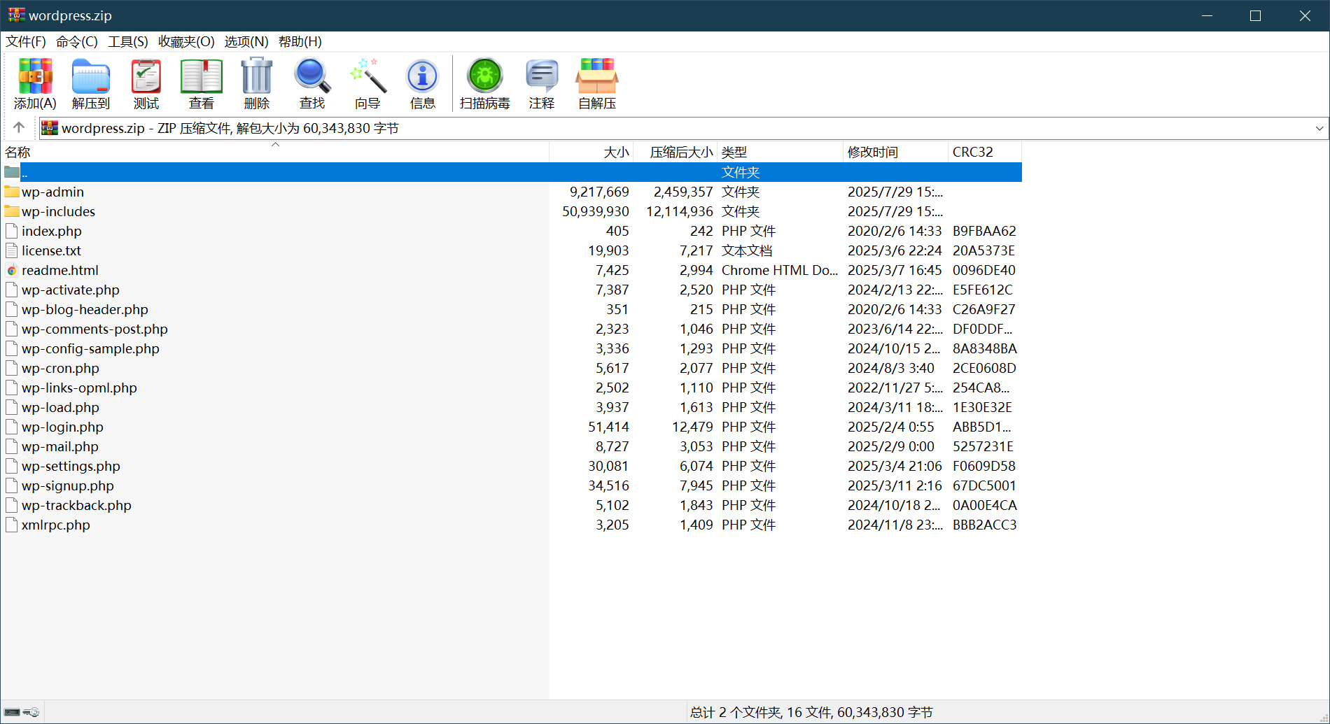 1、解压下载的安装包,删除里面的wp-content文件夹,并重新压缩一个zip文件,如下图所示