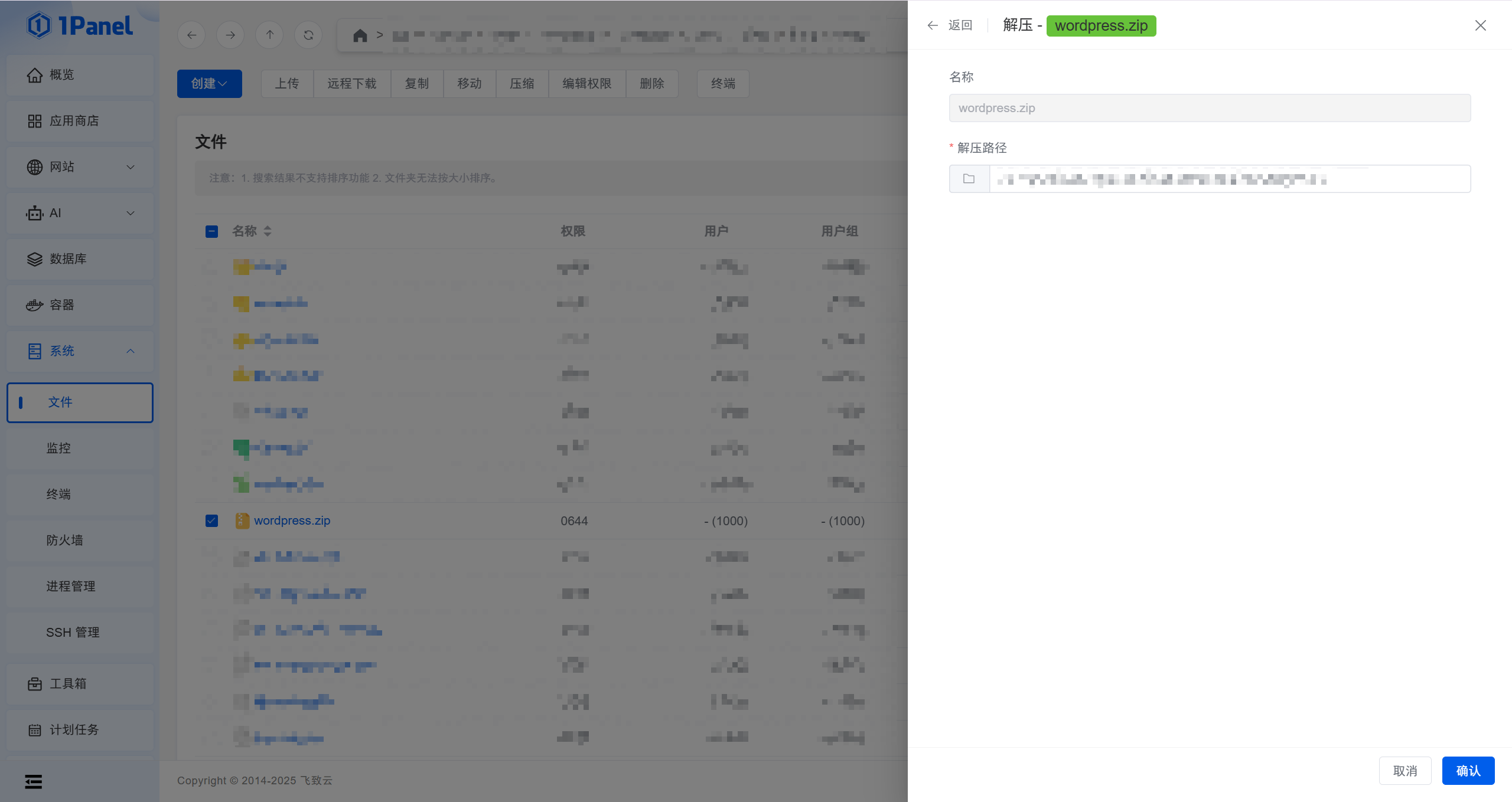 3、把本地剩余的文件上传到服务器覆盖所有文件,注意不要直接在后台解压,否则可能导致权限不正确,将压缩包上传到宝塔面板或者1panel,在网页上解压