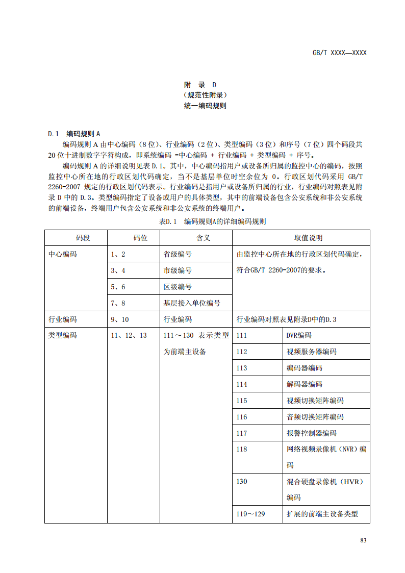 GB28181编码规则由中心编码(8 位) 、 行业编码(2 位) 、 类型编码(3 位) 和序号(7 位) 四个码段共 20 位十进制数字字符构成, 即系统编码 = 中心编码 + 行业编码 + 类型编码 + 序号