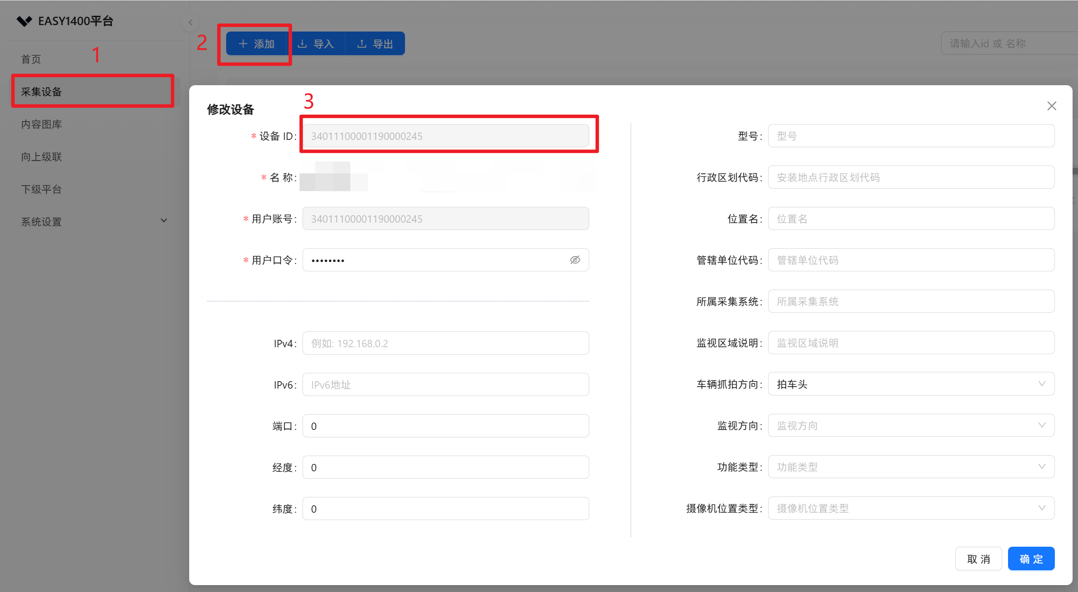 4、用http://IP:1400登录,添加大华相机,设备ID和用户账号填写相机卡口编号,注意第11-13位需要是119,口令自定义