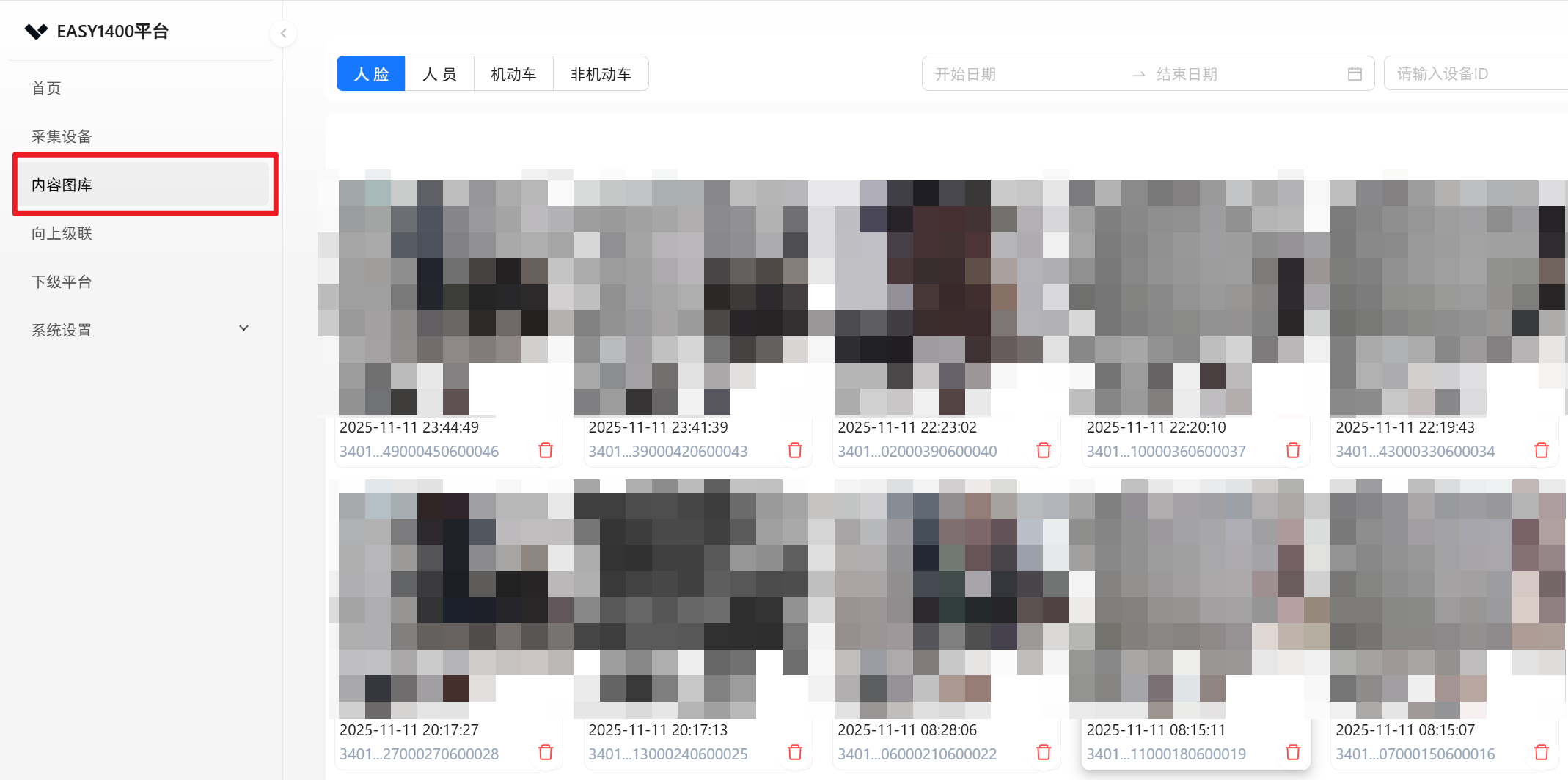 6、注册成功以后,设备会向平台上报抓拍记录,在内容图库中,可以看到很多抓拍结果