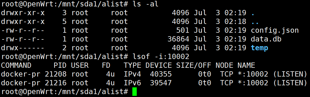 docker run -d --restart=always -v /mnt/sda1/alist:/opt/alist/data -p 10002:5244 --name="alist" xhofe/alist:latest