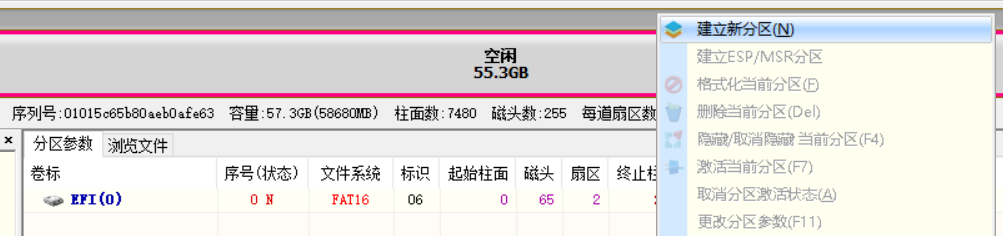选中U盘,在“空闲”处右键,选择建立新分区