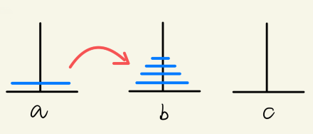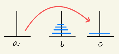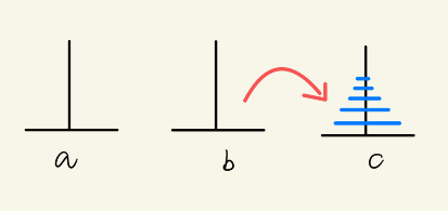 如图要将n个盘子从a柱子移动到c柱子而且在整个移动的过程中都要保证大盘子在下,小盘子在上。