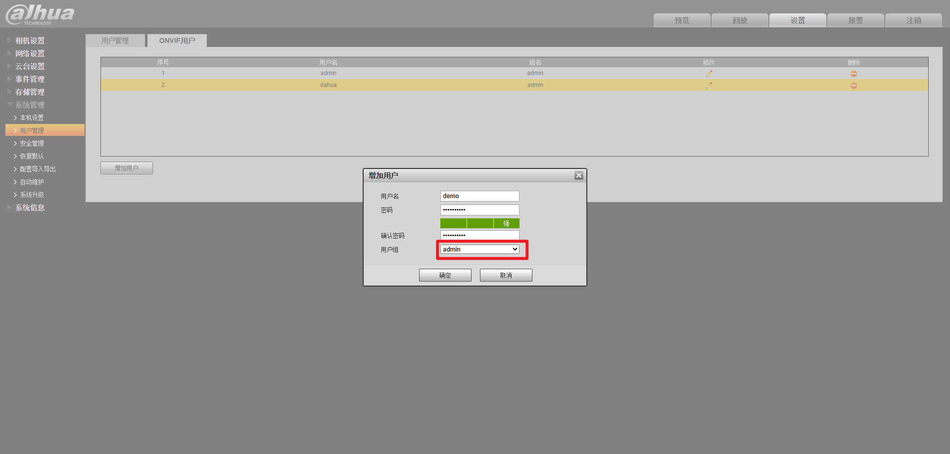 设置->系统管理->用户管理->Onvif用户->增加用户