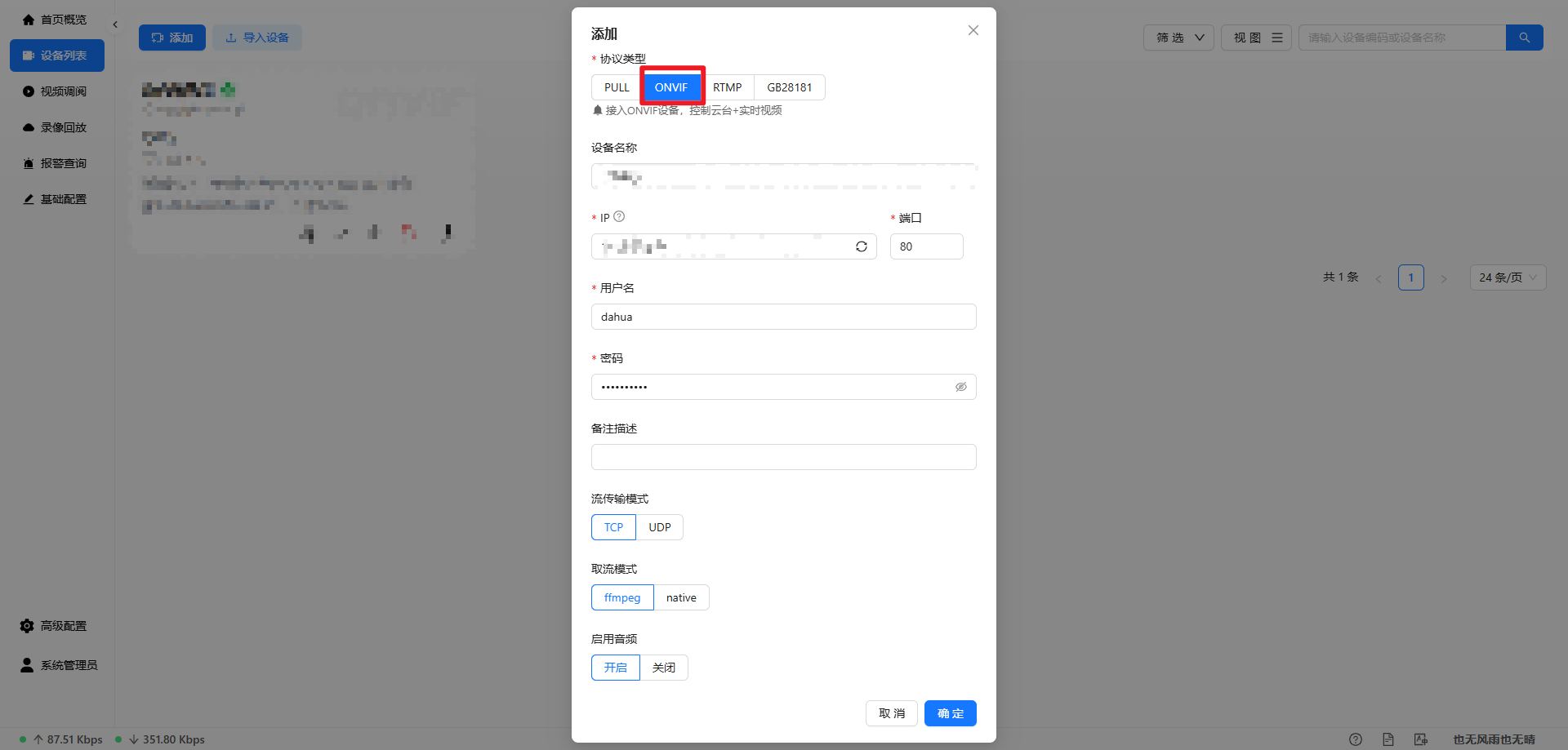 这里以EasyNVR为例,在设备添加页面,协议选择Onvif,设备名称自定义,IP地址填写相机的IP,端口默认为80,用户名和密码填写刚才创建的